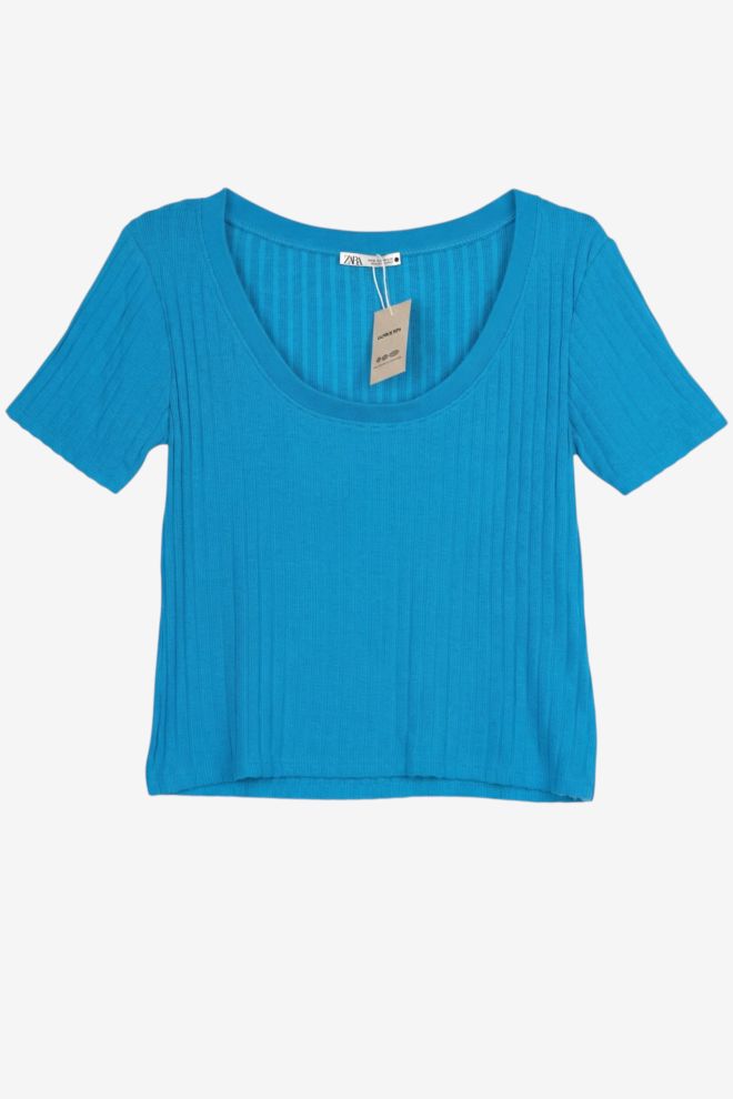 Top. Tela elastizada. Talle de etiqueta/internacional: M. Composición: 49% viscosa y otros. Ancho: 42 cm, Largo: 46 cm | Los talles pueden variar por el calce o moldería de las marcas. Los talles expresados son los de etiqueta.