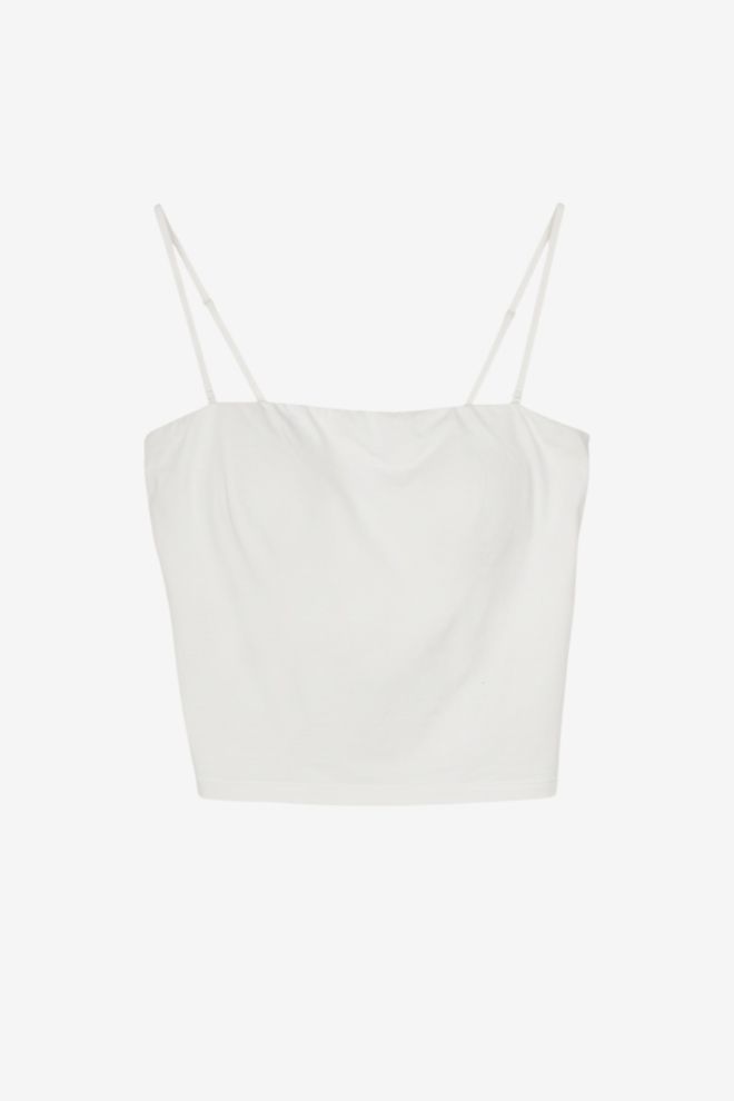 Top. Tela elastizada con taza. Talle de etiqueta/internacional: M. Composición: 37% poliamida,10% elastano y 53% algodón. Ancho: 36 cm, Largo: 42 cm | Los talles pueden variar por el calce o moldería de las marcas. Los talles expresados son los de etiqueta.
